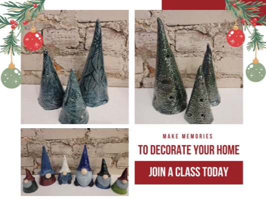 This Mini class meets for two sessions. In the 1st session, you will make either Christmas trees or Gnomes. In the 2nd session, you will glaze them. Meets 11/21 and 12/5 at 6 to 8 pm. Please disregard class dates that are not listed in this description.